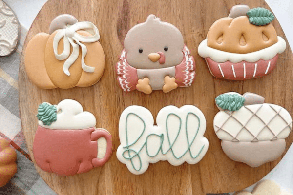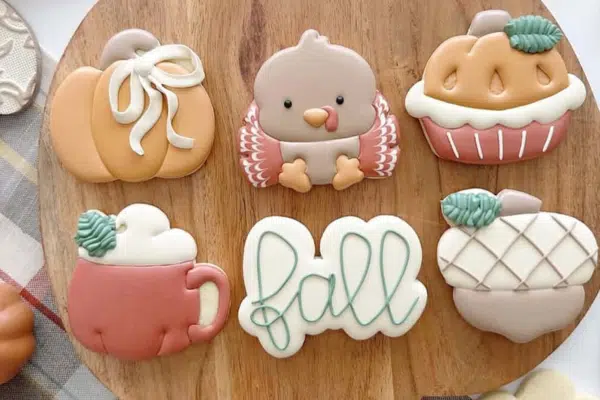 Cozy up for an evening of cookie decorating fun! In this beginner-friendly class, you’ll learn to decorate a beautiful set of fall-themed cookies — featuring a pumpkin, turkey, pie, mug, acorn, and “fall” script cookie.